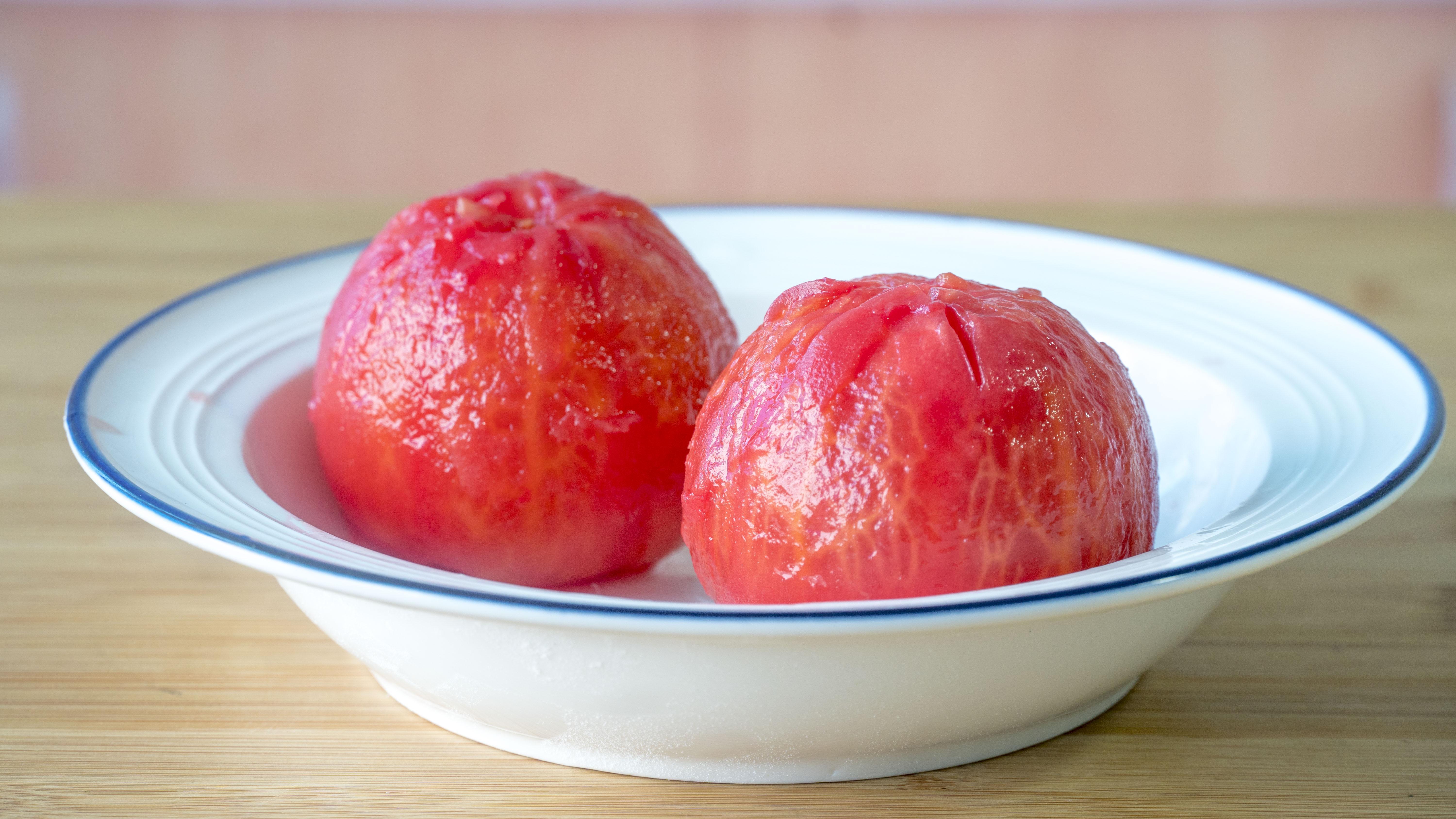 2、西紅柿2個,去皮後切塊兒;先把裏面的汁兒擠出來後再切成小顆粒,加1勺鹽醃製20分鐘殺出西紅柿裏面剩餘的水份;