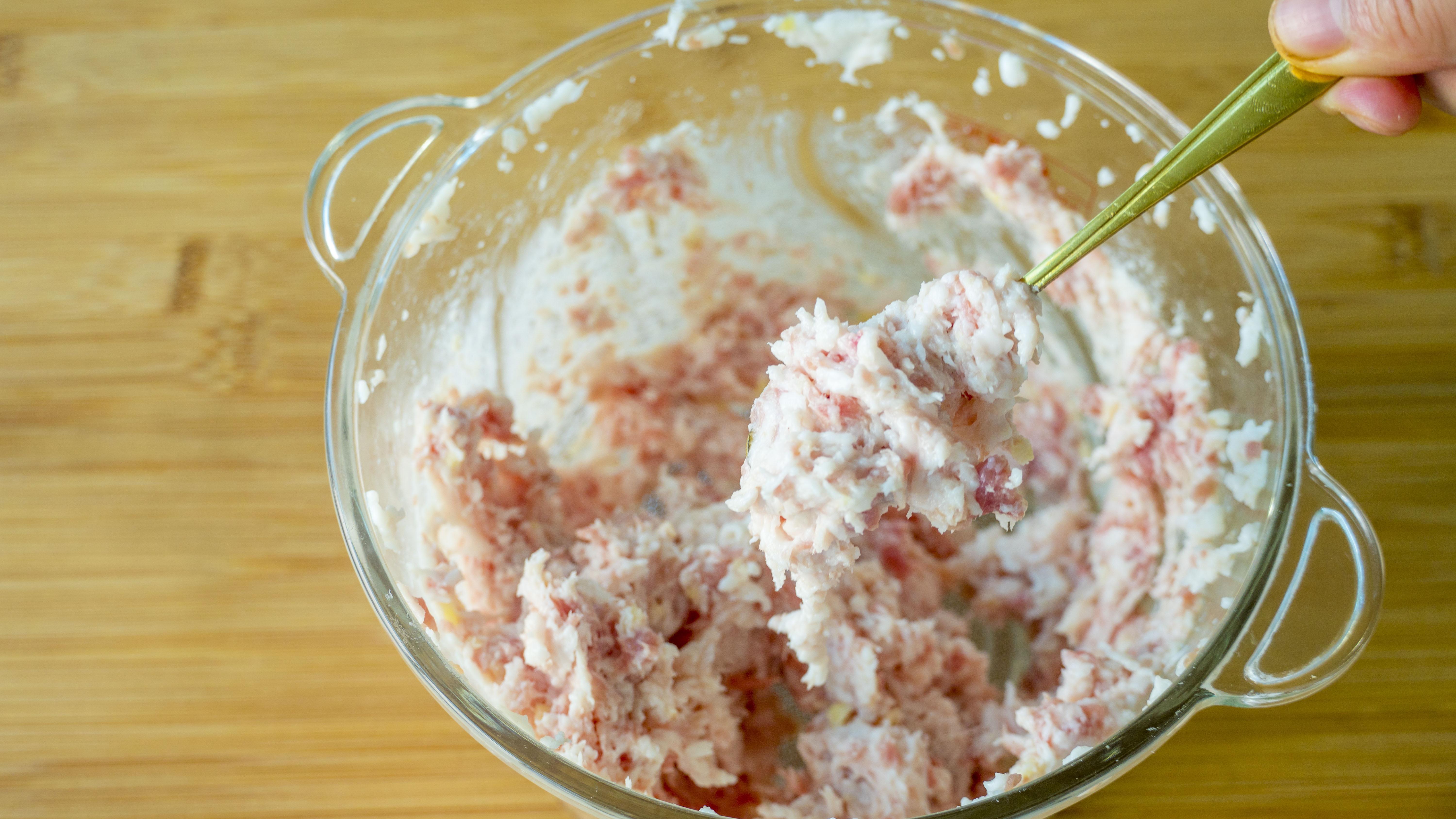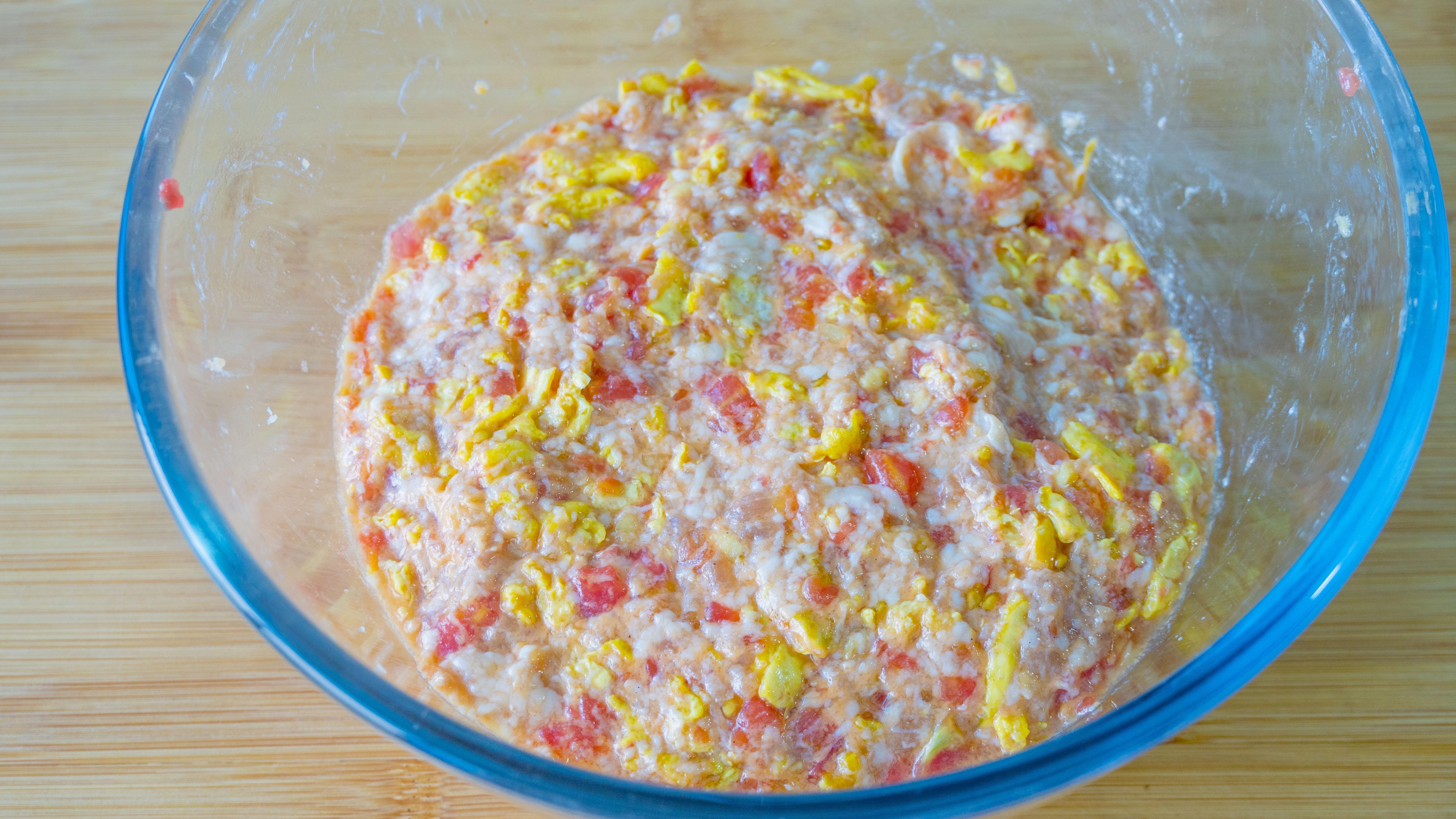 4、現在來調餡兒:豬肉、西紅柿汁、鹽、胡椒粉、生抽、糖,朝着一個方向攪打上勁,讓豬肉把西紅柿汁都吸收進去;西紅柿和雞蛋最後加進來拌勻;