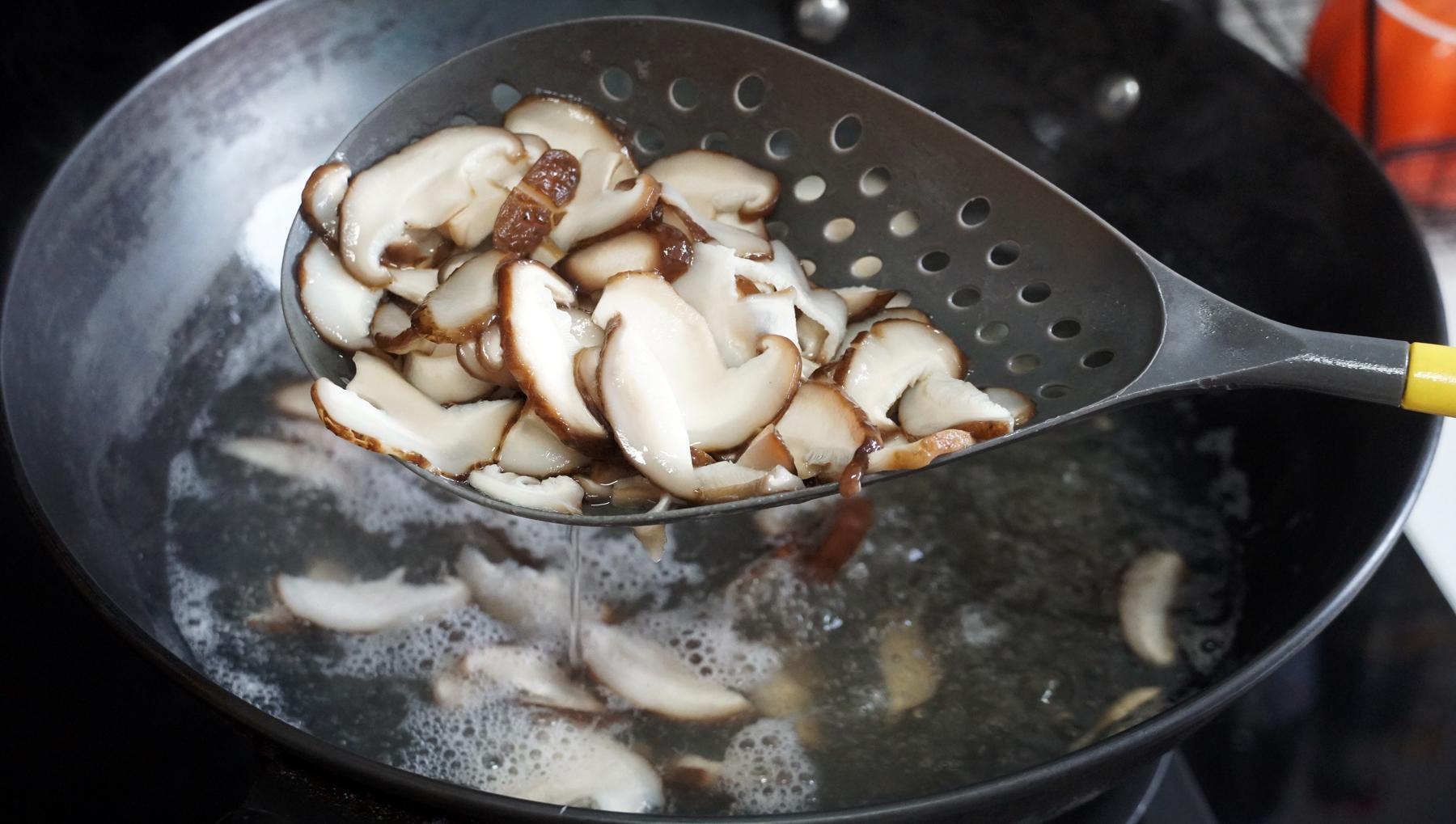 2、香菇和青椒都是切的條,先把香菇焯一下水,煮軟了就撈出來;