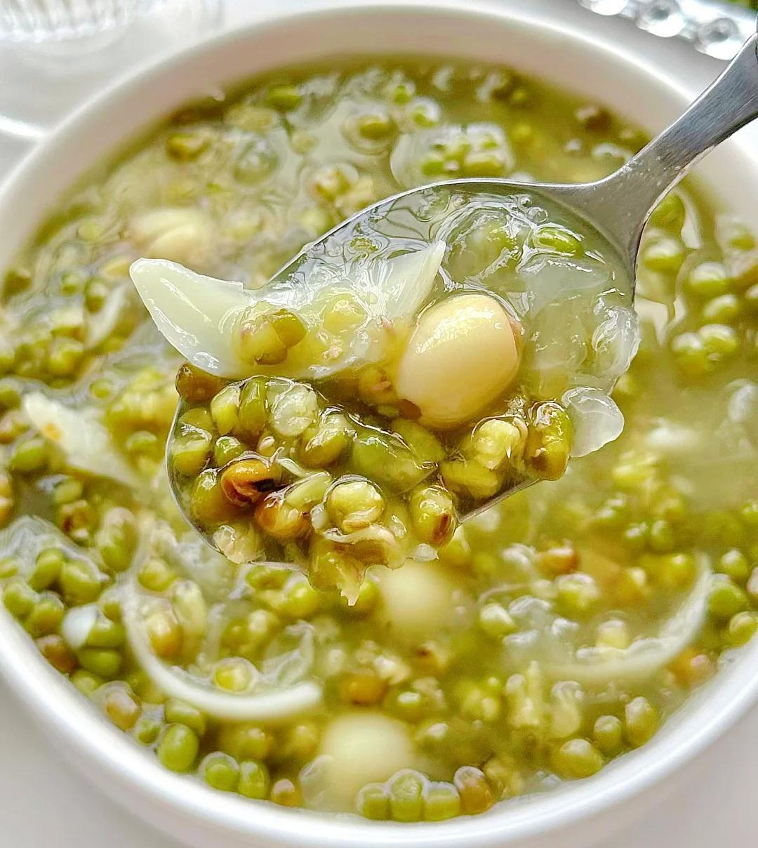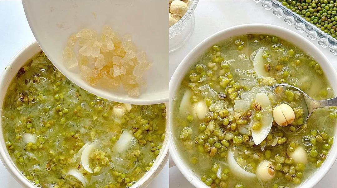 3、綠豆煮軟後加百合、蓮子,然後繼續煮20分鐘,把綠豆煮開花。
