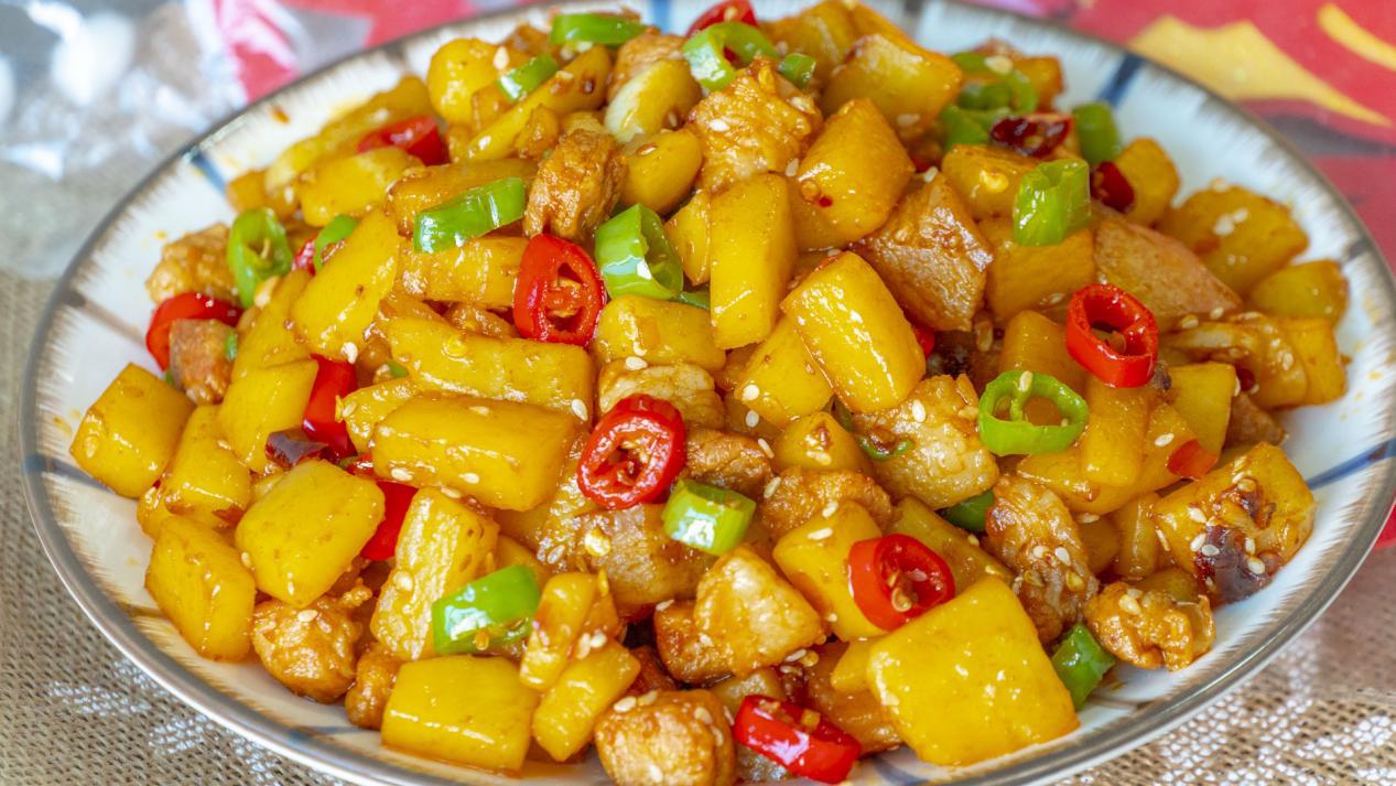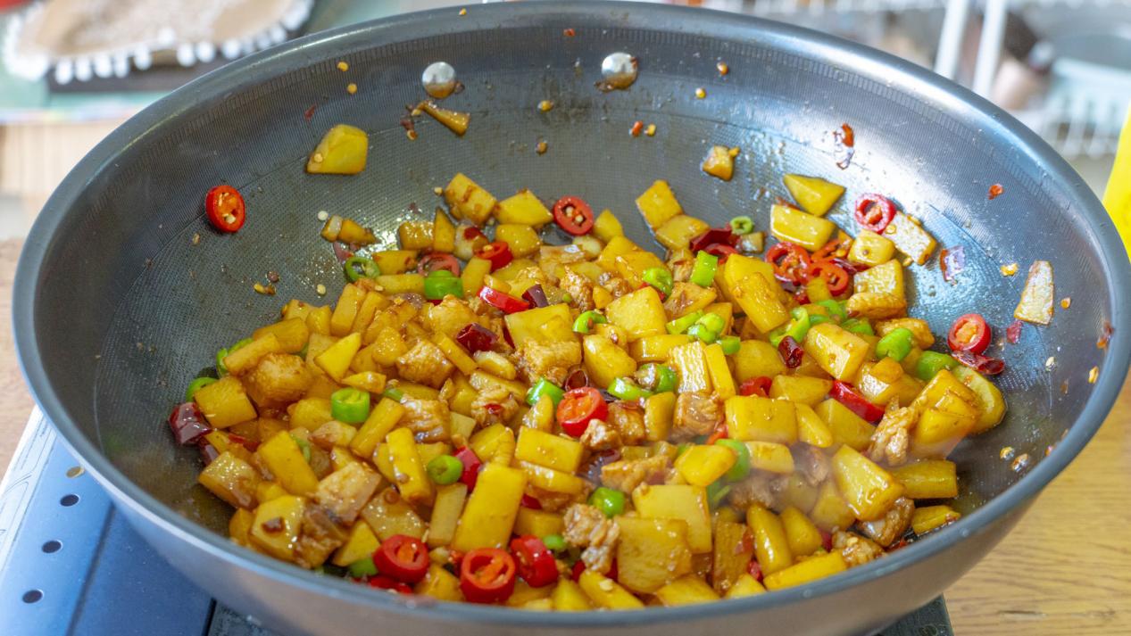 5、然後倒入土豆丁,大火翻炒均勻後調味兒,生抽、老抽、蠔油,拌勻後繼續煸炒斷生,然後加青紅椒翻炒1分鐘,加鹽、雞精調味兒,炒勻後就可以關火了。
