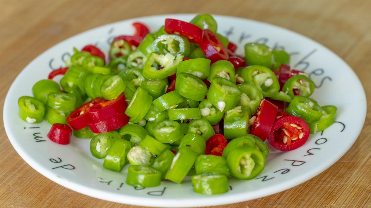 3、青紅辣椒各3個,清洗乾淨後切小圈圈備用。
