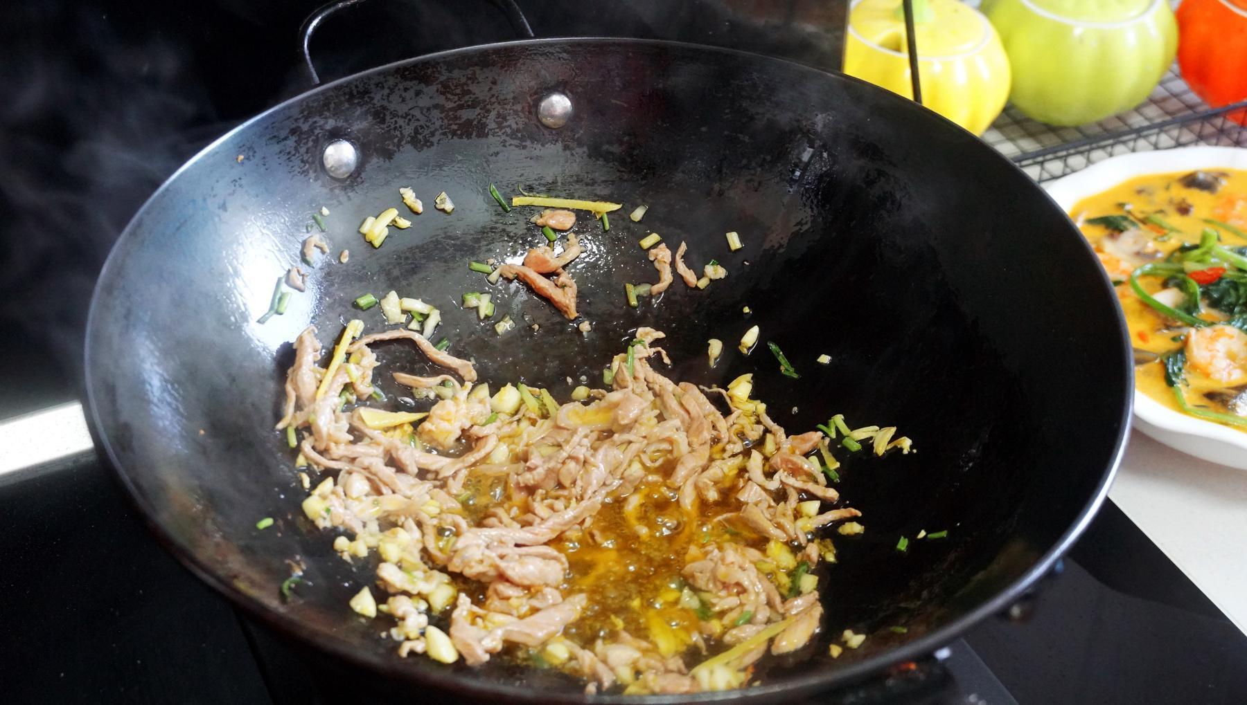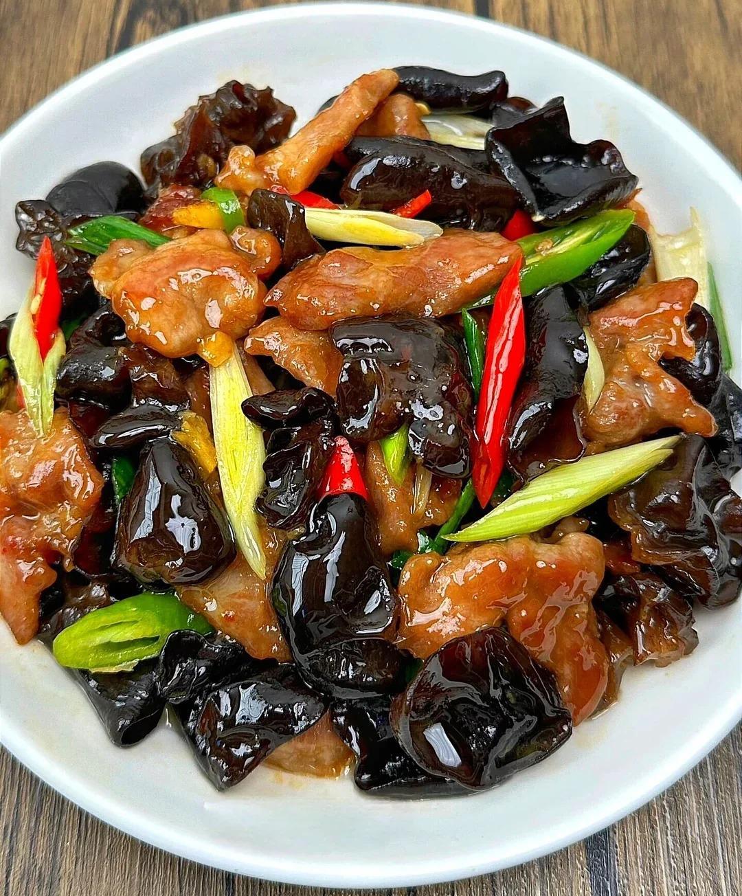 2、木耳提前焯了一下水,其他的都生的,油熱了加點姜蒜爆香,放一點肉絲一起炒,調味加點料酒、生抽、蠔油、糖、鹽 ,
