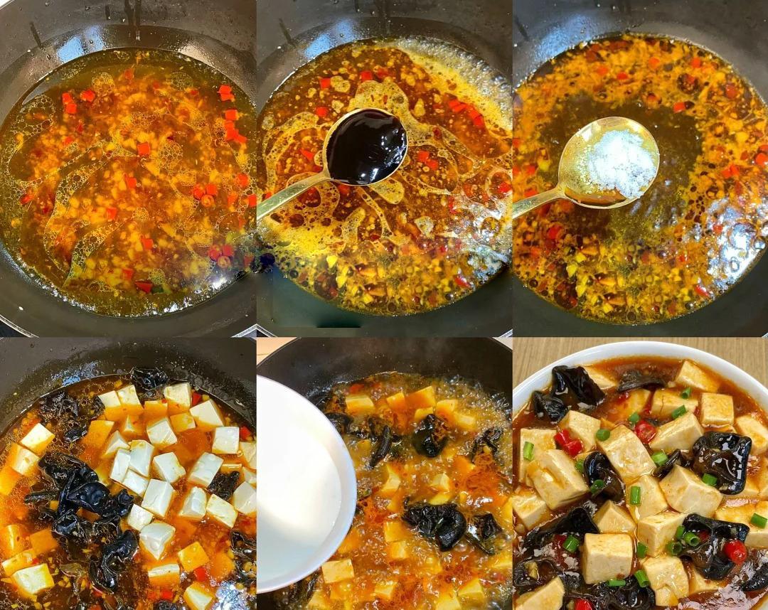 4、調味加生抽、蠔油、雞精、白糖、一點點的胡椒粉,煮開後再把豆腐和木耳倒進來煮5分鐘。