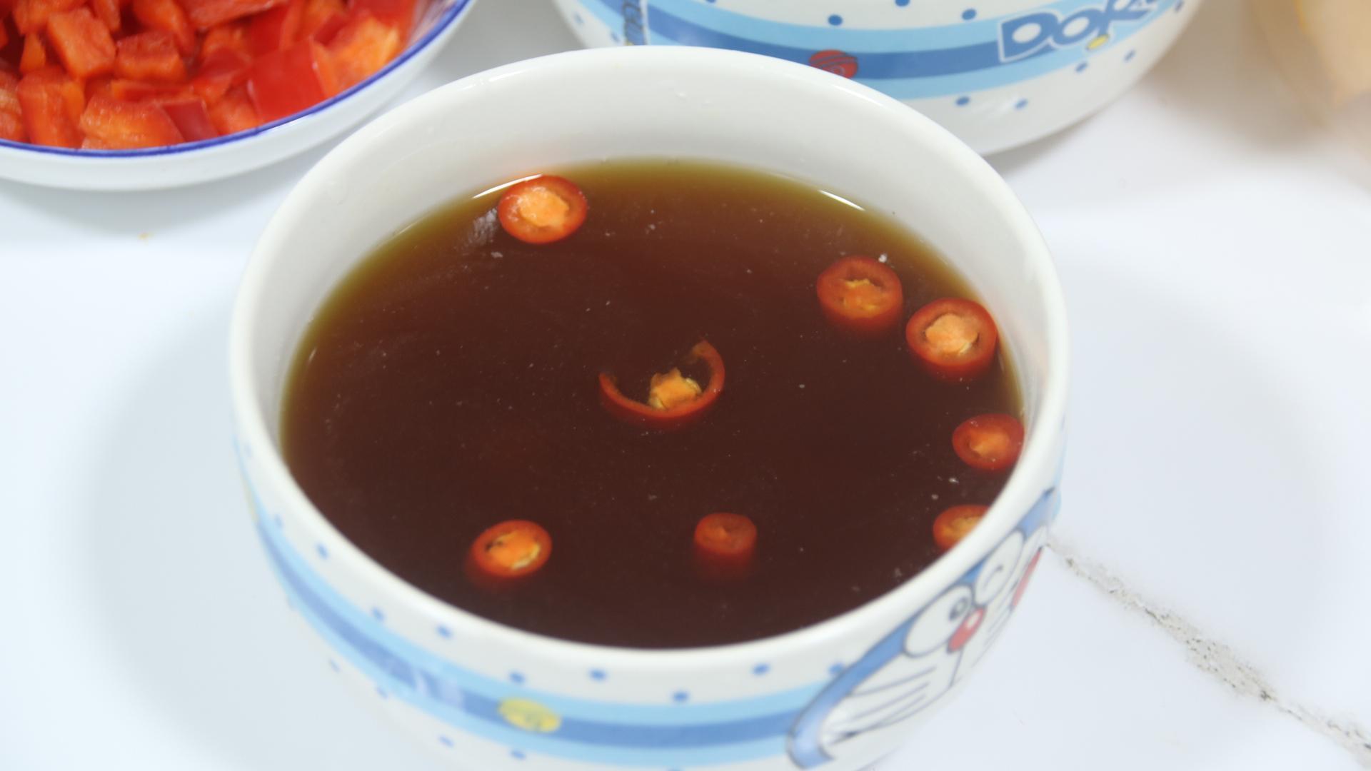 3、現在來調醬汁:碗中加入小米椒、蠔油、生抽、鹽、雞精、少許糖、適量清水、一勺澱粉,攪勻備用;