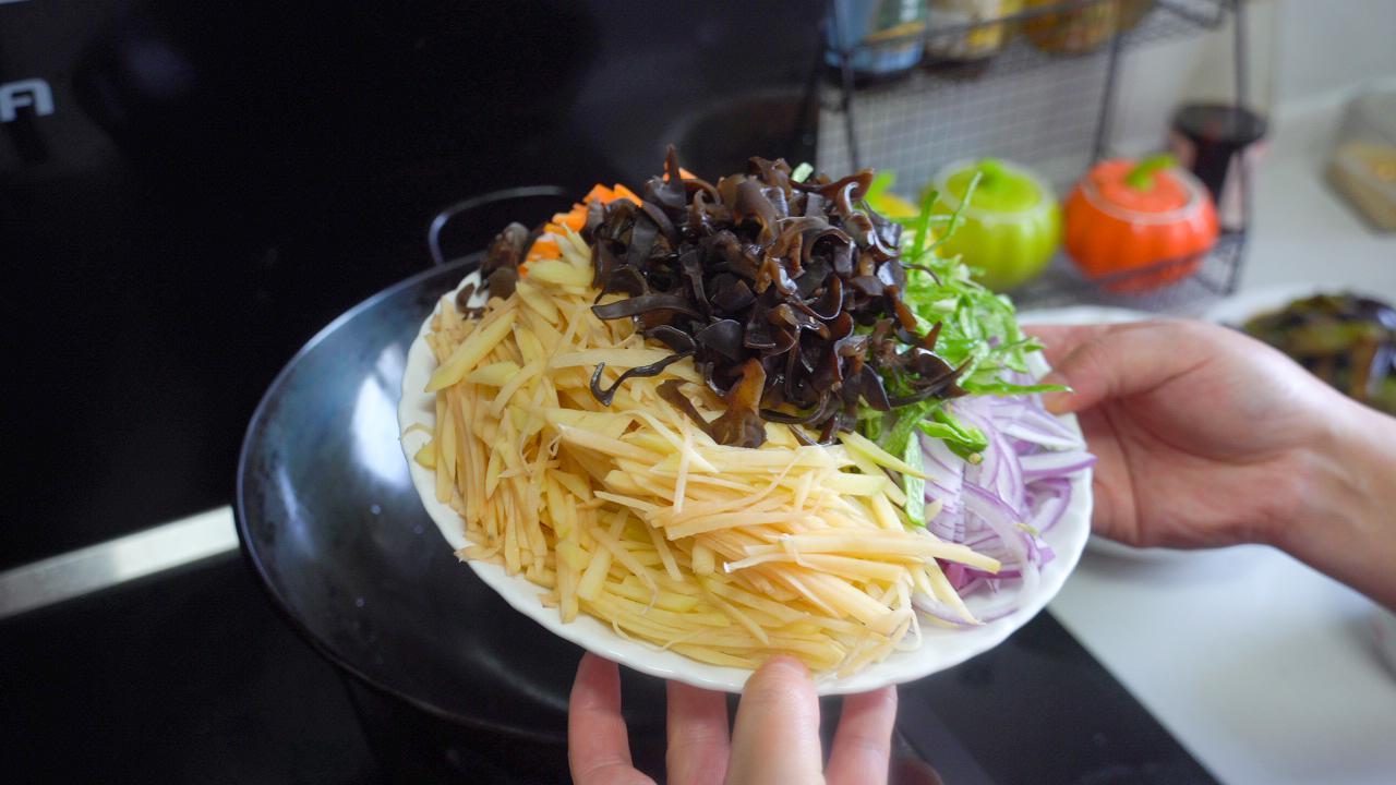 3、然後把所有的素菜都倒進來,大火翻炒,炒熟,我這裏面就是土豆絲、胡蘿蔔絲、青椒絲,還有一點洋蔥和木耳,再來一把蒜末和一把蔥花,翻炒個兩下就可以出鍋了;