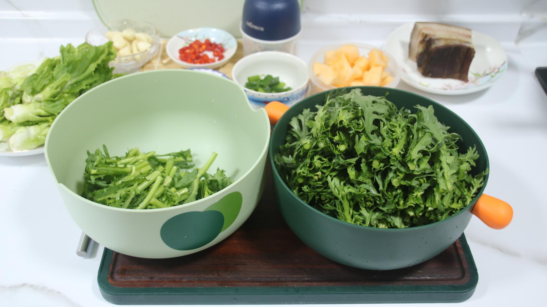 1、這是我自家種的茼蒿,已經清洗乾淨了,直接改刀切成長段,根部和葉子分開放;