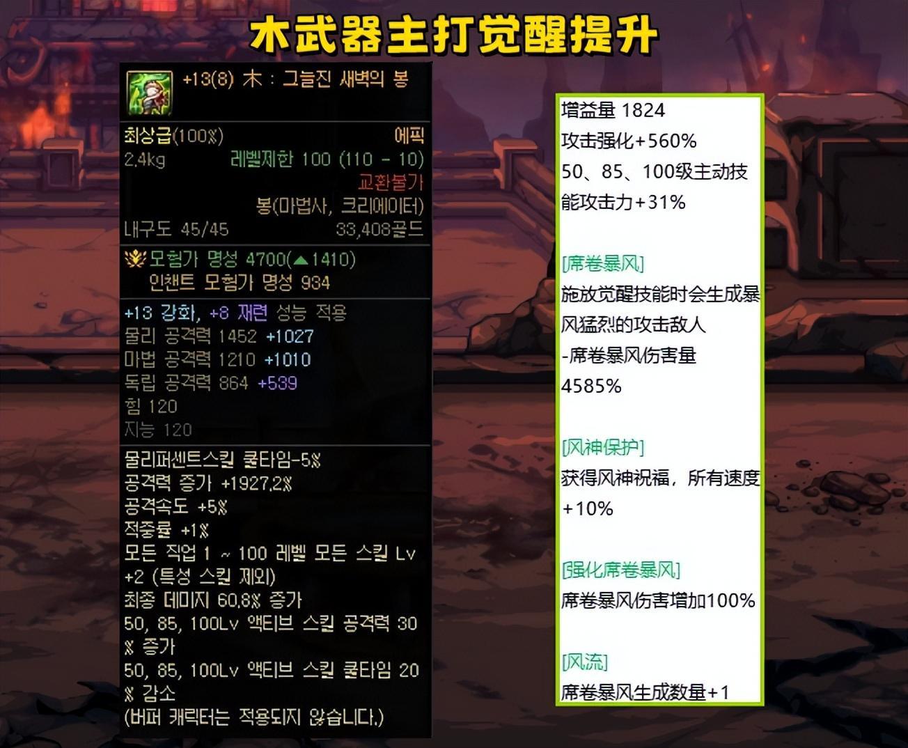 基礎技攻比較低,但主打覺醒加成,不僅提高了覺醒傷害、而且還減少了覺醒冷卻時間,對標現有的“跨越者武器”。