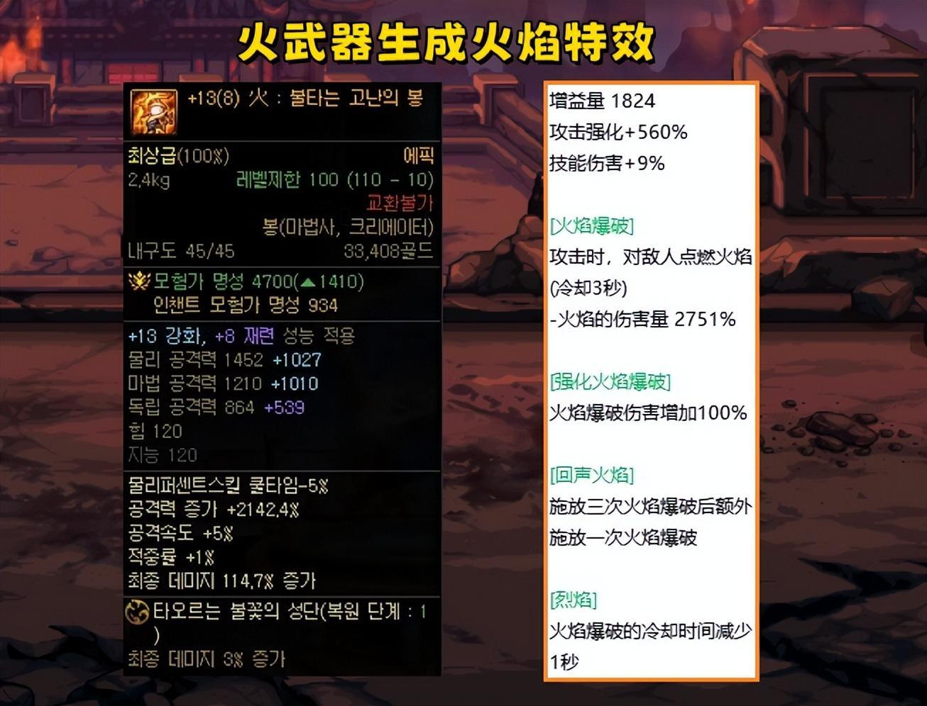 【進階屬性】技攻+9%,攻強+560%,攻擊敵人時生成火焰效果。