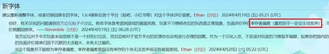 4月19日新漢化上線遭到玩家批評後,《星露穀物語》中文維基的一名編輯人員留言建議漢化組應玩家的反饋修改字體,隨後他得到的一名署名爲Stevenlele的用戶回覆:“漢化問題去官方論壇帖子討論;玩家不習慣修改後的東西是正常現象,負面評價存在“倖存者偏差”(喜歡的不一定會主動發聲),不會因爲存在負面評價就撤回修改”。