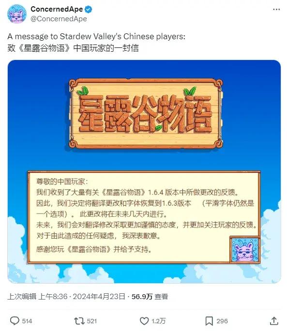 北京時間4月23日上午,ConcernedApe在自己的推特號上發表了一篇中文道歉信,並表示會將新舊中文字體都作爲可選項留給玩家們。