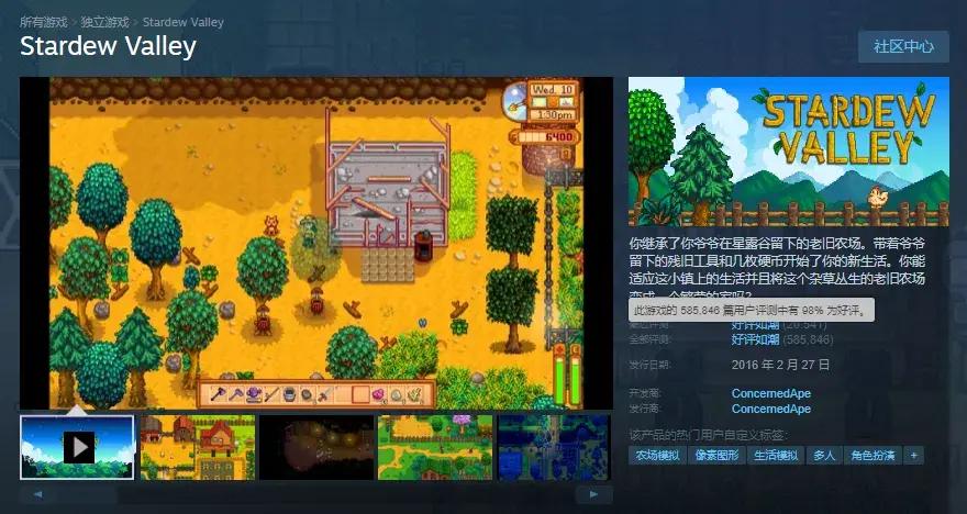 在Steam平臺上好評如潮的遊戲裏,98%好評率的《星露穀物語》算得上門面擔當。