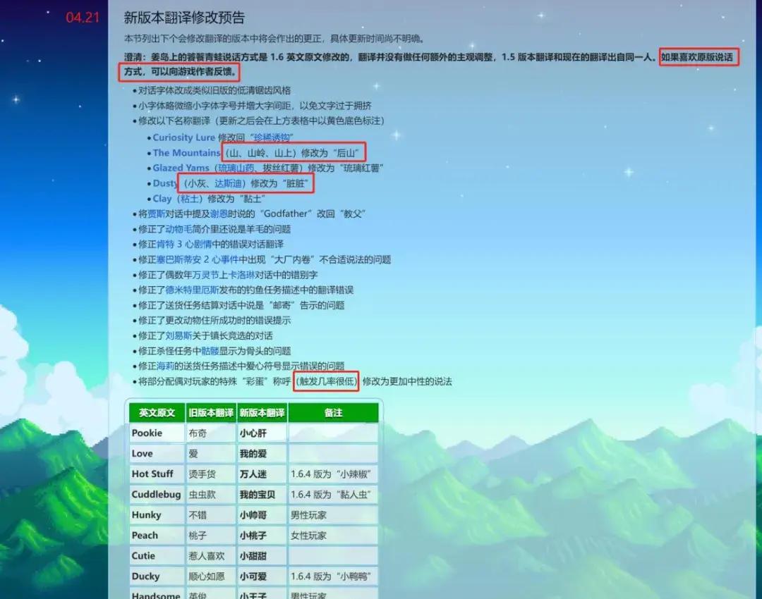 還有像是新手必種的“防風草”(parsnips)變成了“歐防風”,屬於是學名修正,雖然有不少老玩家覺得自己熟悉的事物被陌生的詞替代了,但這個翻譯本身無可指摘。