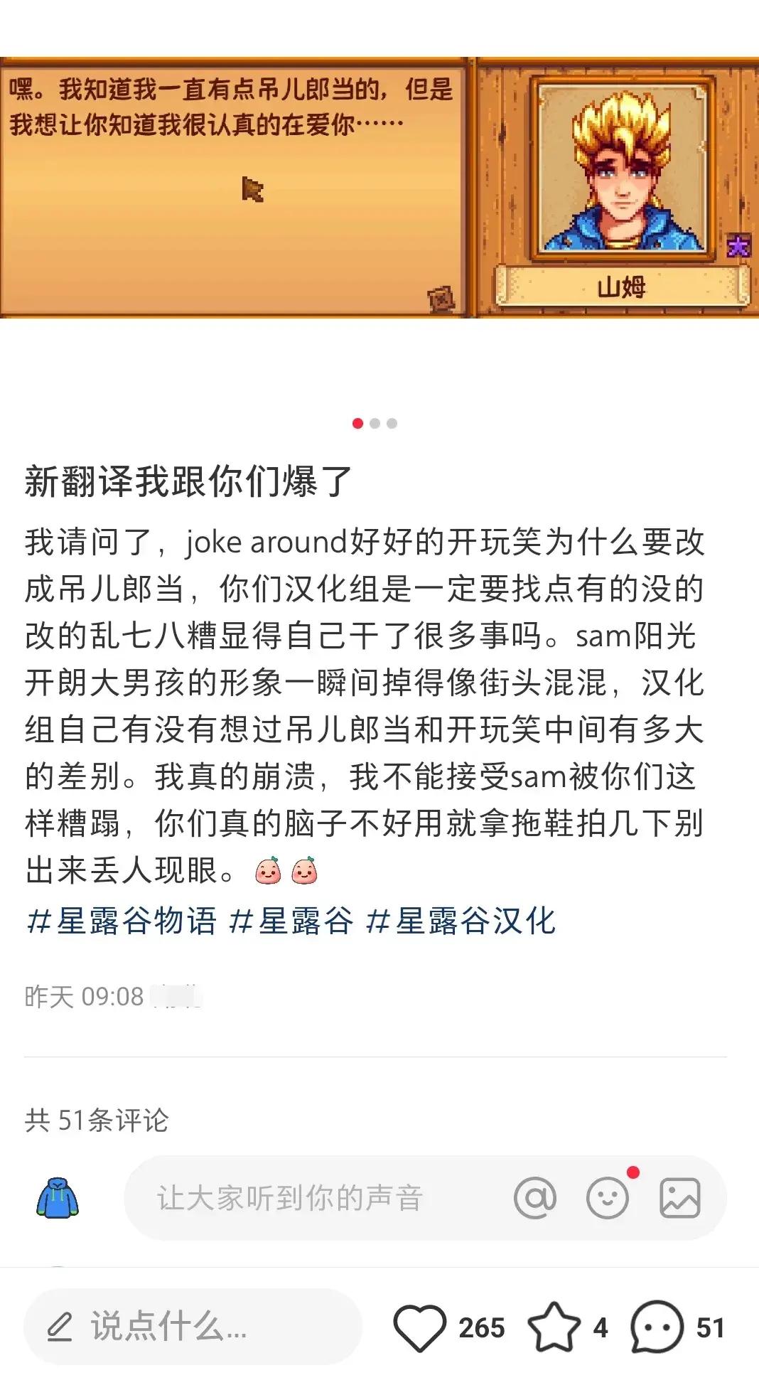 好巧不巧,就在不久前,小紅書上曾出現一篇帖子埋汰《星露谷》的原版翻譯用葷段子“夾帶私貨”,曾引發一陣頗爲熱烈的討論,而沒過幾天,對這些內容動了刀的新版漢化就出現在了大家面前,自然成爲了這場爭論的延伸,被牽扯進性別議題。