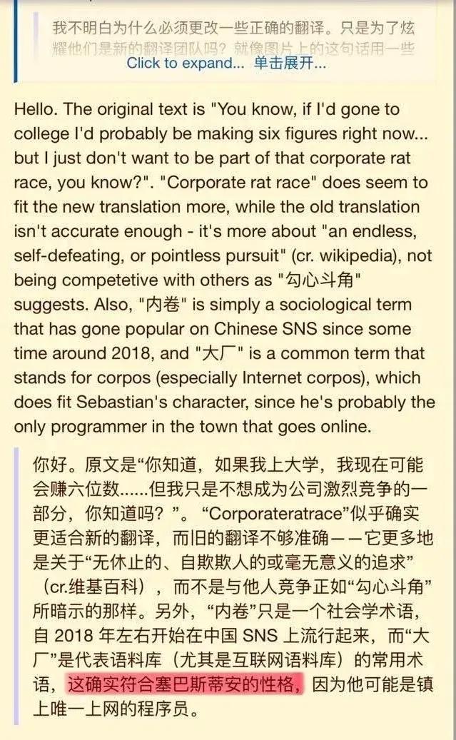 事情單是到這裏,還屬於相當尋常的對於翻譯傾向的喜好之爭,但風波還是很快被擴大化了。