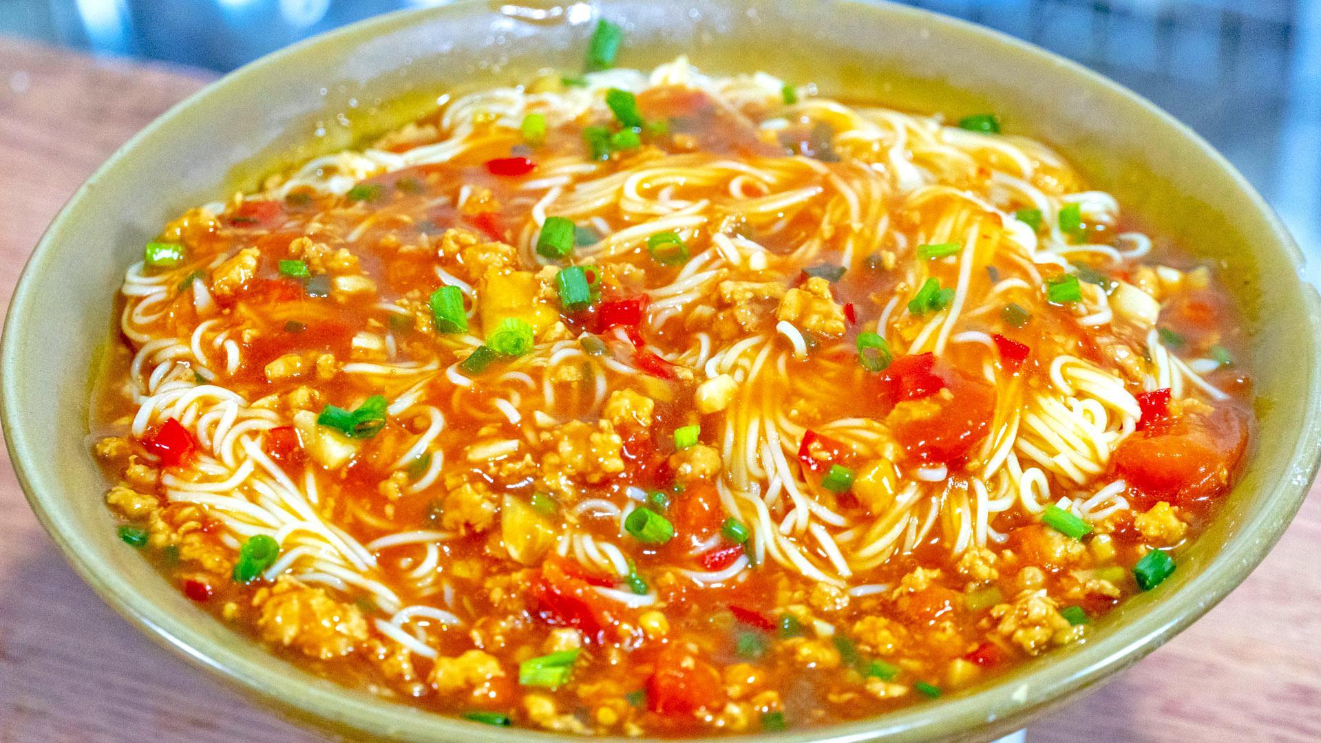 5、接着我們來煮掛麪,水開下鍋,麪條煮熟後撈出來,裝入碗裏後再舀上炒好的西紅柿肉沫醬。拌一拌讓麪條吸飽湯汁,最後撒點小蔥花就可以開喫了,這個麪條我們家最愛。又香又入味,做法還簡單。