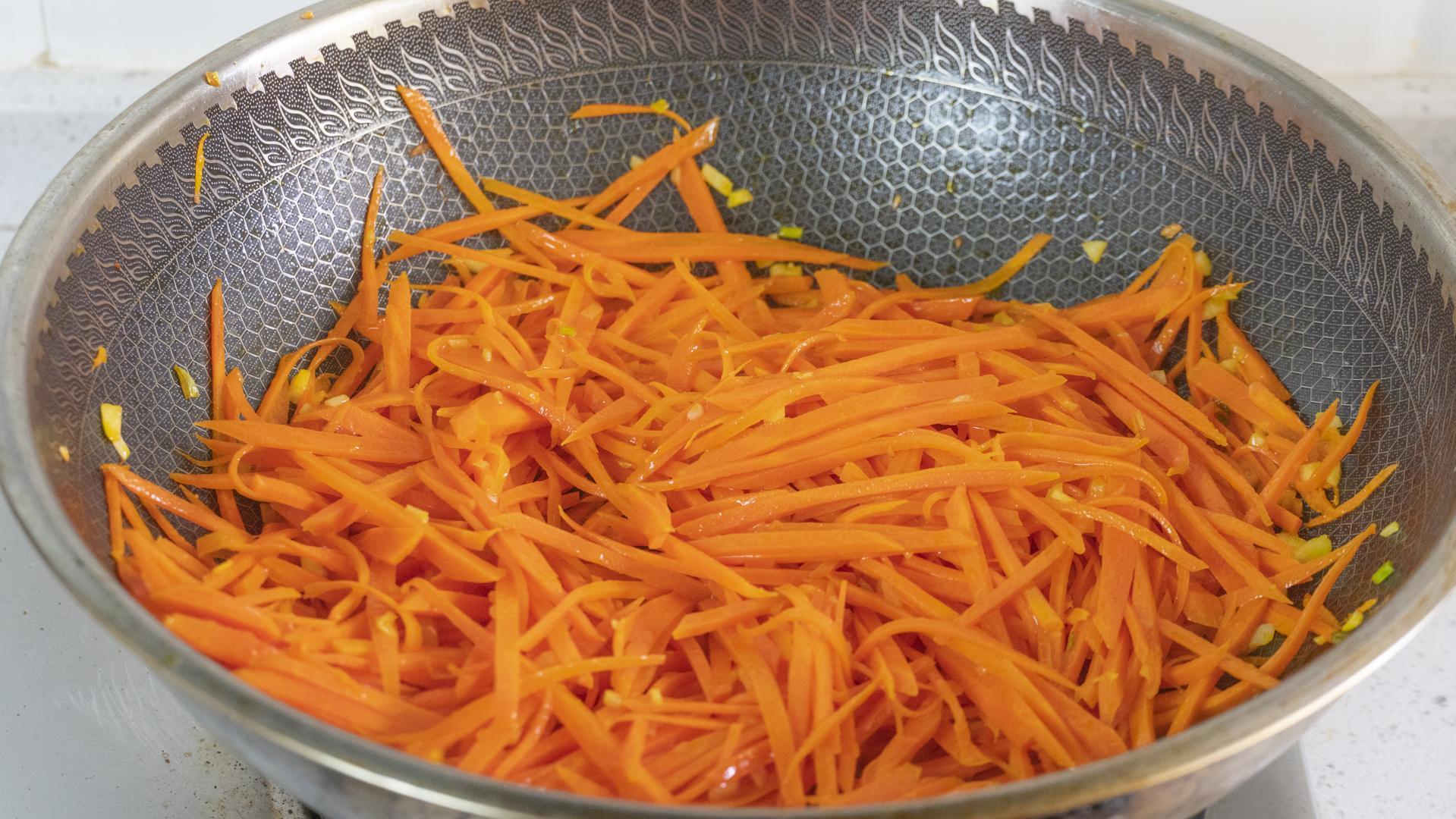 4、起鍋熱油,下蒜末和蔥白爆香。接着把胡蘿蔔倒進來,大火翻炒3分鐘,先把胡蘿蔔絲炒軟炒熟。
