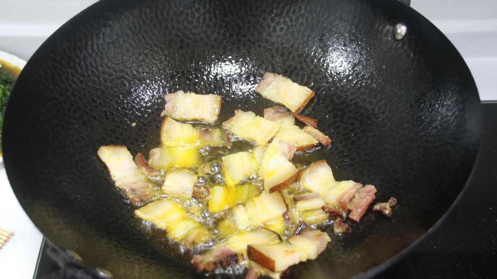 4、起鍋燒油,油熱後將臘肉片下鍋爆炒,炒至肥肉部分微微透明的狀態,加入蒜沫辣椒丁爆出香味,