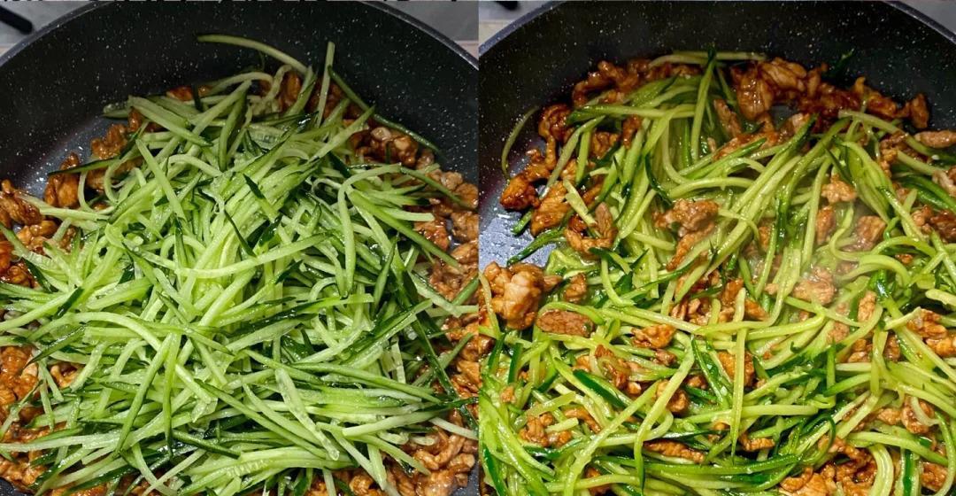 4、黃瓜絲倒進來,大火翻炒,1分鐘就夠了,調味加點鹽和糖、雞精就可以出鍋了。這個黃瓜炒出來就是很清爽的,起來超級解膩。