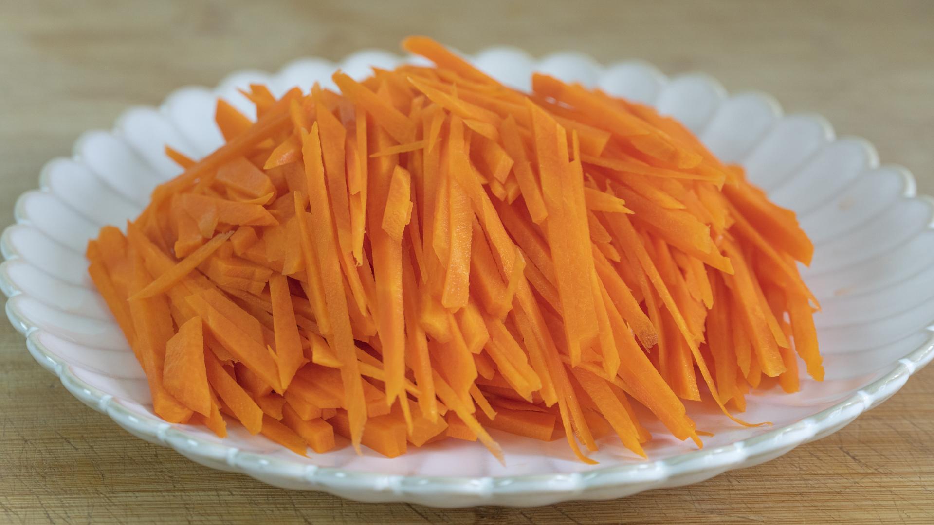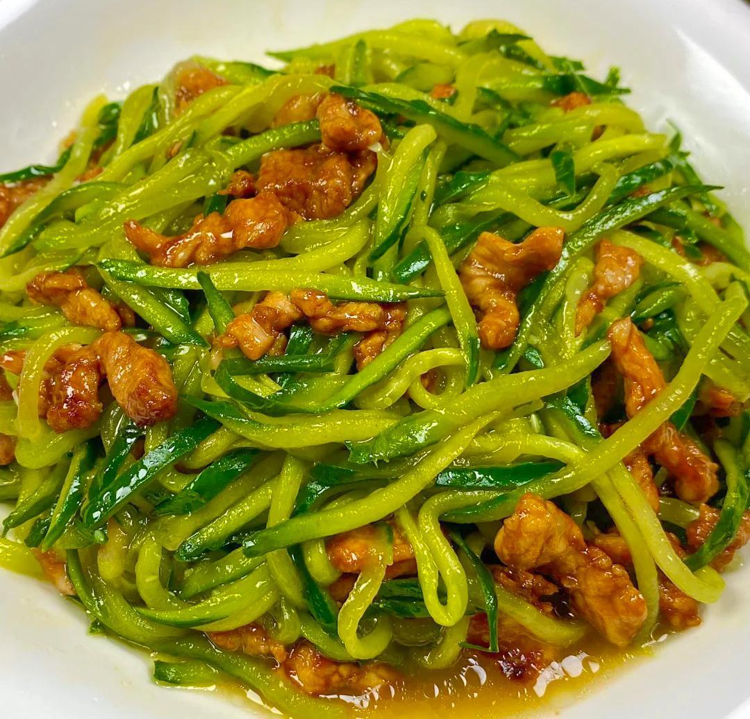 2、黃瓜一根,洗淨,不用削皮,切成細絲,其實也不用太細,因爲黃瓜裏面的水分多,炒過後會縮水。