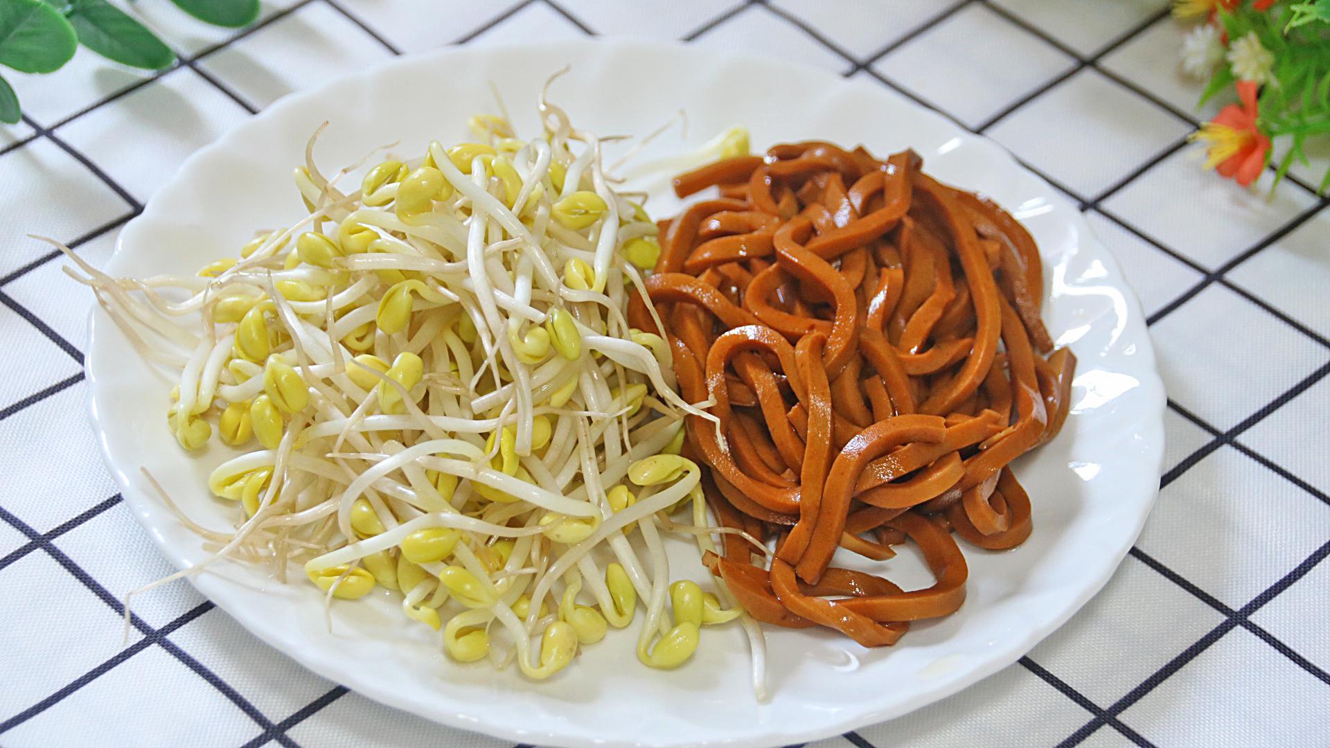 2、搭配一點千葉豆腐絲,這個是滷製過的,是有底味的,直接炒就很好喫;一把黃豆芽洗淨了備用;