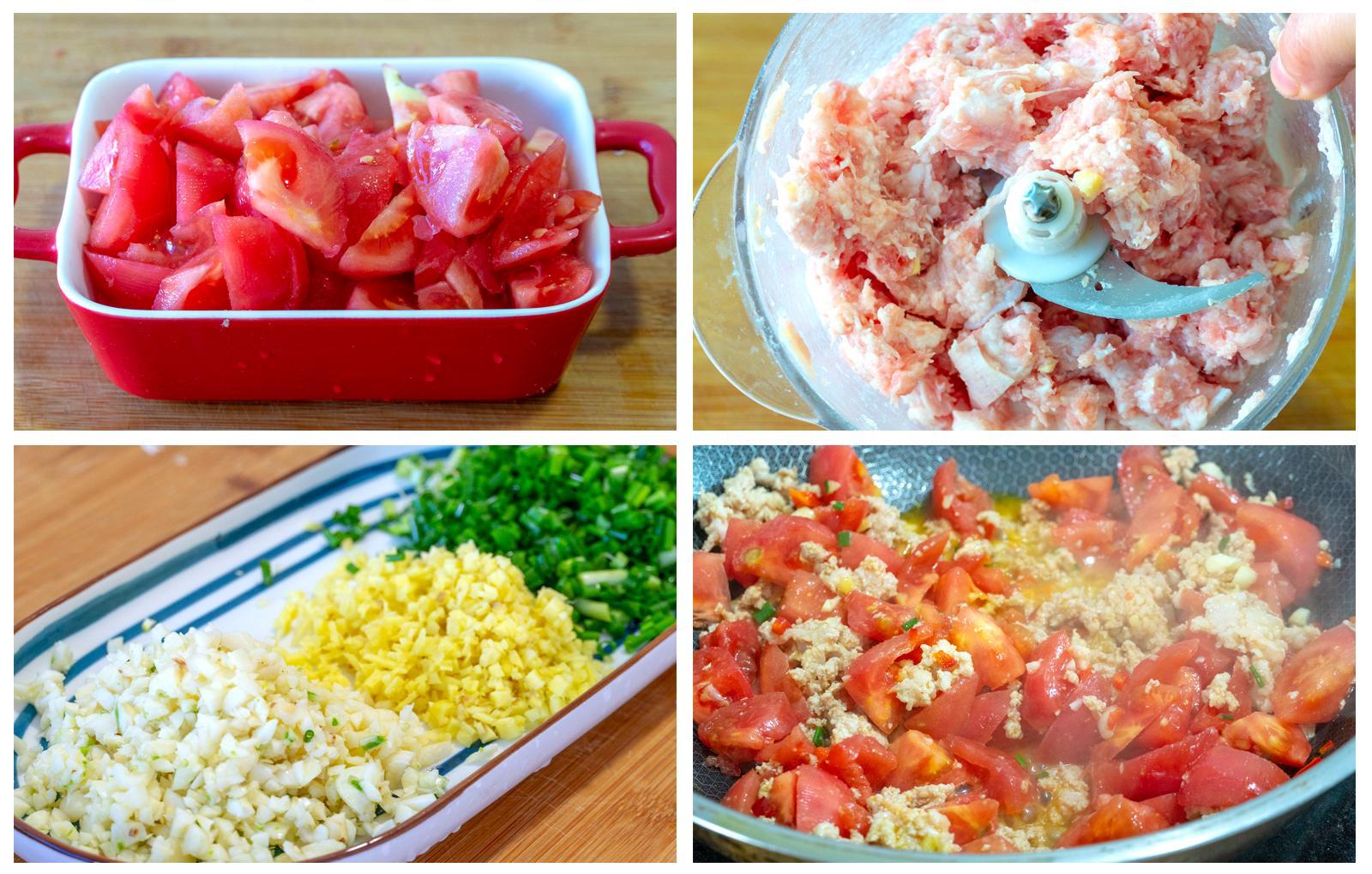 3、起鍋熱油,下肉末翻炒,顏色變白後加蔥薑蒜辣椒爆香,炒出香味後,西紅柿也倒進來一起炒,加一勺鹽會更容易出汁兒,接着來調味,生抽、老抽、鹽。
