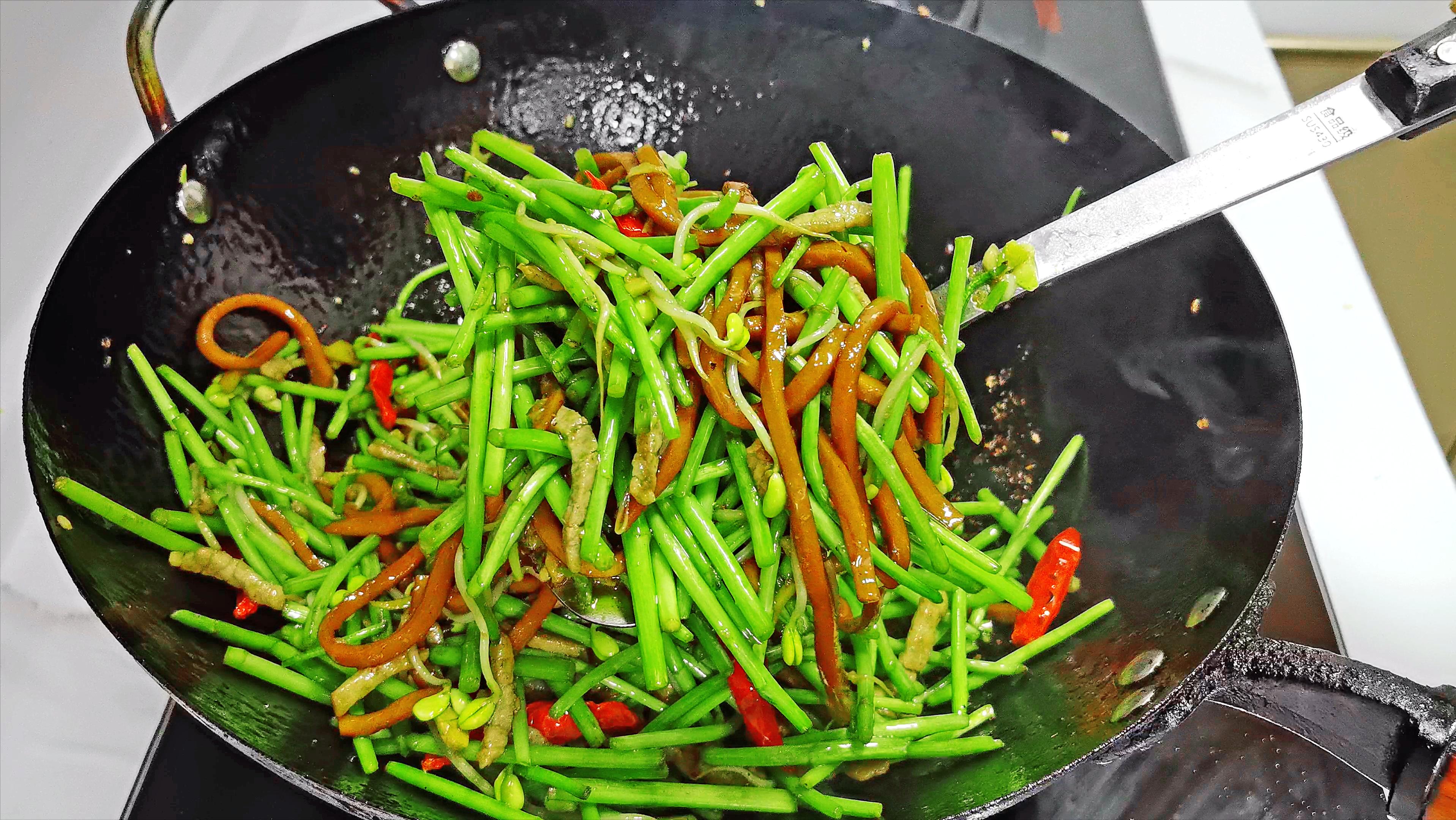 6、炒勻後加一把蔥花,就可以關火出鍋了。
