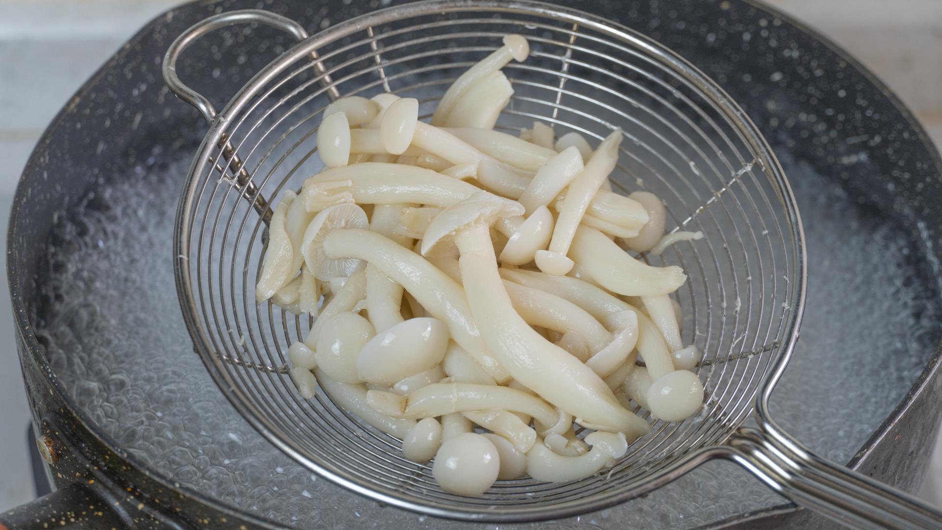 2、接着起鍋燒水,水開加一勺鹽,然後下入白玉菇焯水,大火煮2分鐘左右,撈出來過一下涼水,用手擠幹水分。