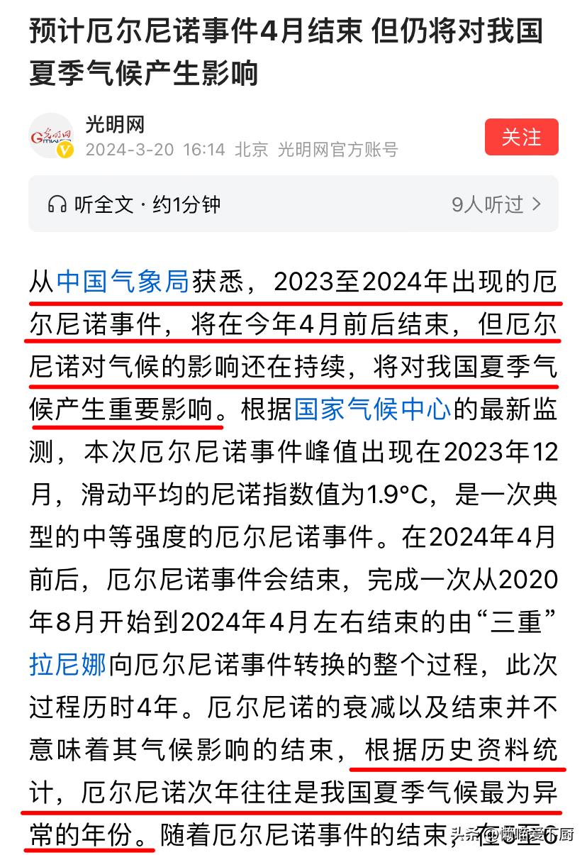 據中國氣象局的預測,2023至2024年出現的厄爾尼諾事件,將在今年4月前後結束,但其對氣候的影響還在持續。換句話說,今年夏天氣候會受即將結束的厄爾尼諾的影響。此外,去年出現的厄爾尼諾氣候現象,也會對今年夏天氣候產生影響。