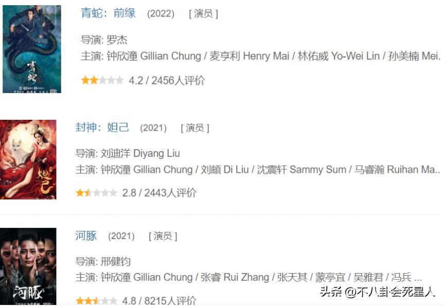 近幾年,阿嬌相繼拍攝了好幾部網絡大電影,包括《封神:妲己》,《河豚》,《青蛇:前緣》等,但全部都是評分未過5分的爛片。
