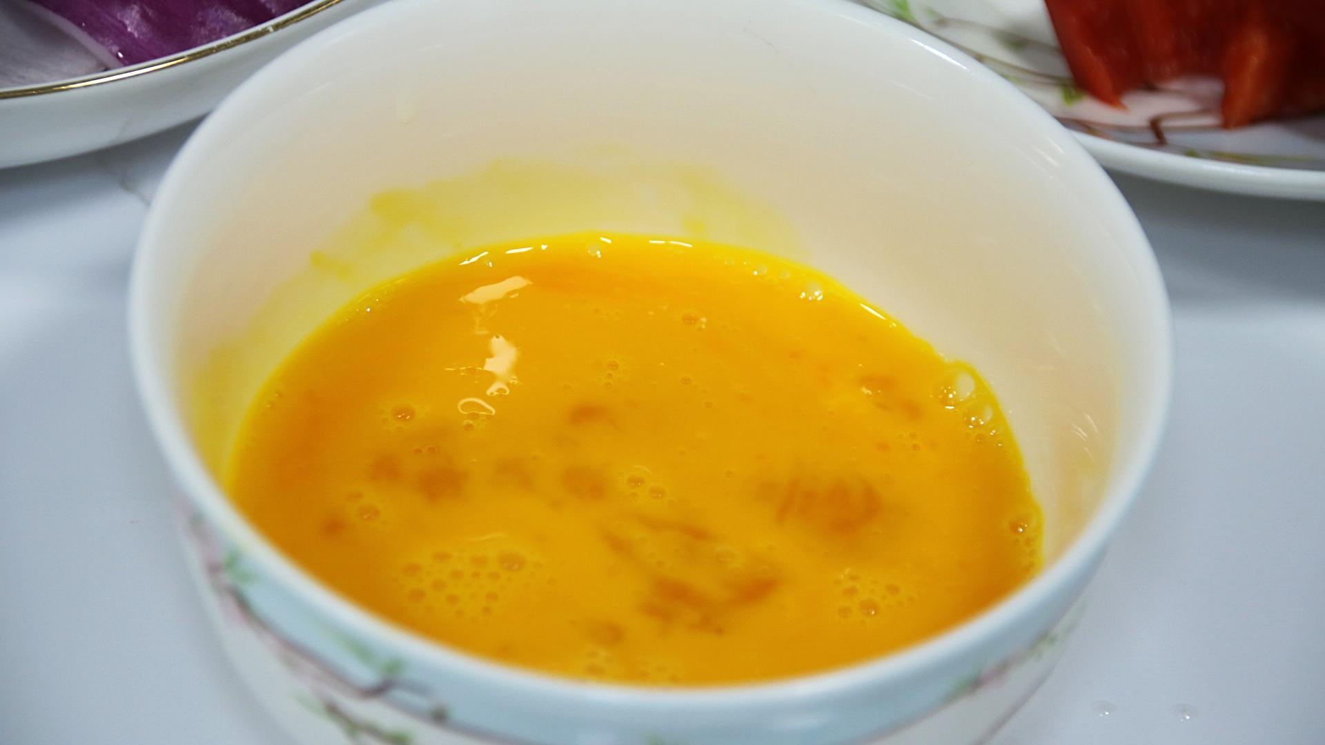 1、午餐還安排一個洋蔥炒蛋,洋蔥切成塊狀、青紅椒各一個也切成塊;