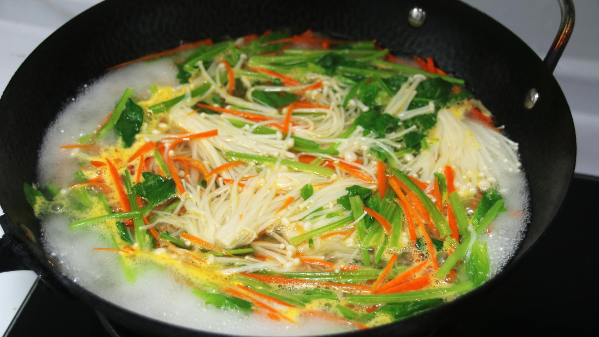 1、主要食材就是金針菇、菠菜、胡蘿蔔,首先金針菇去掉根部,用手撕成小朵,放入淘米水中浸泡10分鐘 ,然後水開大多衝洗幾遍;