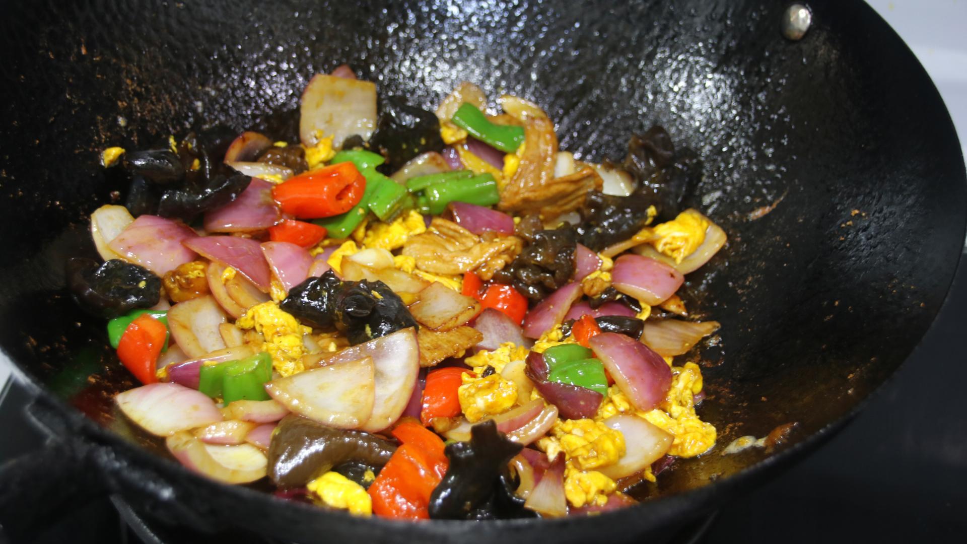 7、下入洋蔥翻炒,洋蔥稍微變軟後倒入青紅椒炒至斷生,倒入雞蛋、木耳、肉片後調味、鹽、雞精、生抽、蠔油、少許澱粉水,大火翻炒均勻就可以出鍋了;