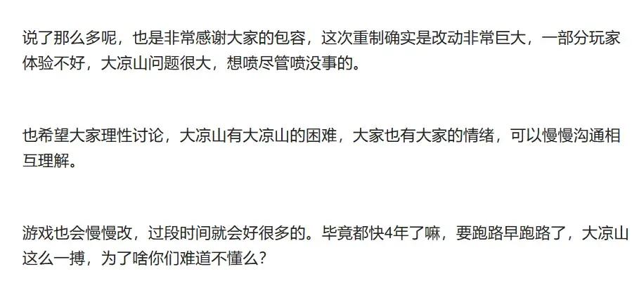比如說,大涼山解決了玩家比較在意的其中一個問題,然而解決它會引發三個新的問題,特別是和角色強度和數值相關的內容。或者說還有一些由於經驗不足導致團隊成員找不到最優解,最後也就形成了玩家們口中的:問題我們都說了,只是你們不肯改。