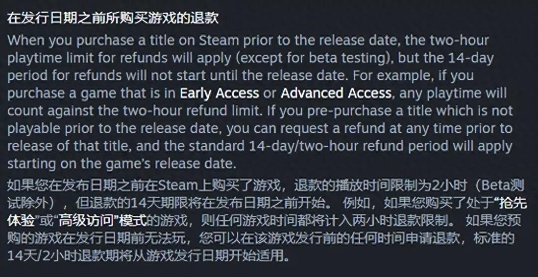 按Steam退款新規所示,如果玩家購買了搶先體驗版或預購豪華版的遊戲,任何遊戲時間都將計入兩小時退款限額中,一旦超過兩小時,無論遊戲是否發售,都將無法滿足基礎的退款要求。
