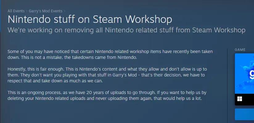 不過最近,Garry''s Mod開發者發佈了一個更新事件,其中提到,最近他們正在下架創意工坊裏所有有關任天堂的內容。之所以這麼做,是因爲他們接到了任天堂方面的訴訟。