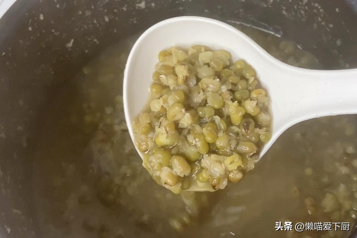 3、大火煮開後,轉小火熬1個小時,熬至綠豆變軟爛;