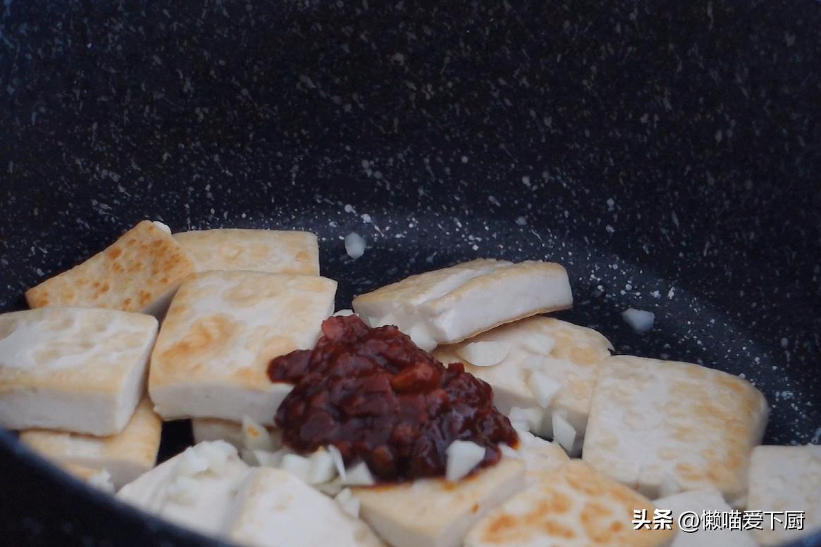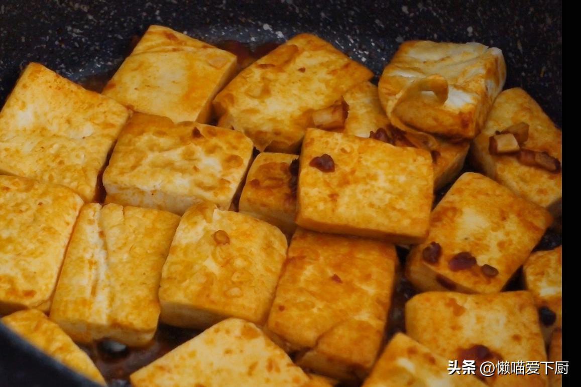 3、鍋中加油,下入豆腐,小火煎至兩面金黃;