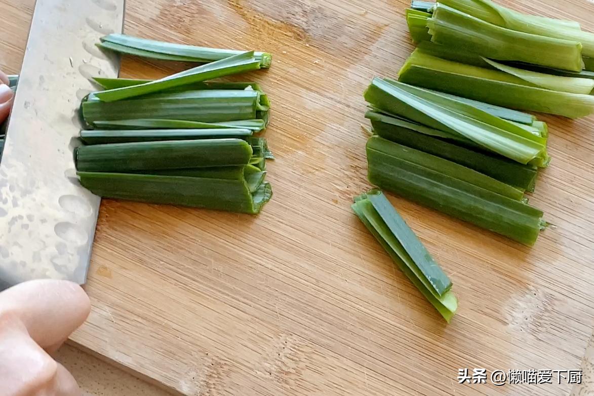 2、蒜苗洗淨,去掉根鬚,再斜切成小段;