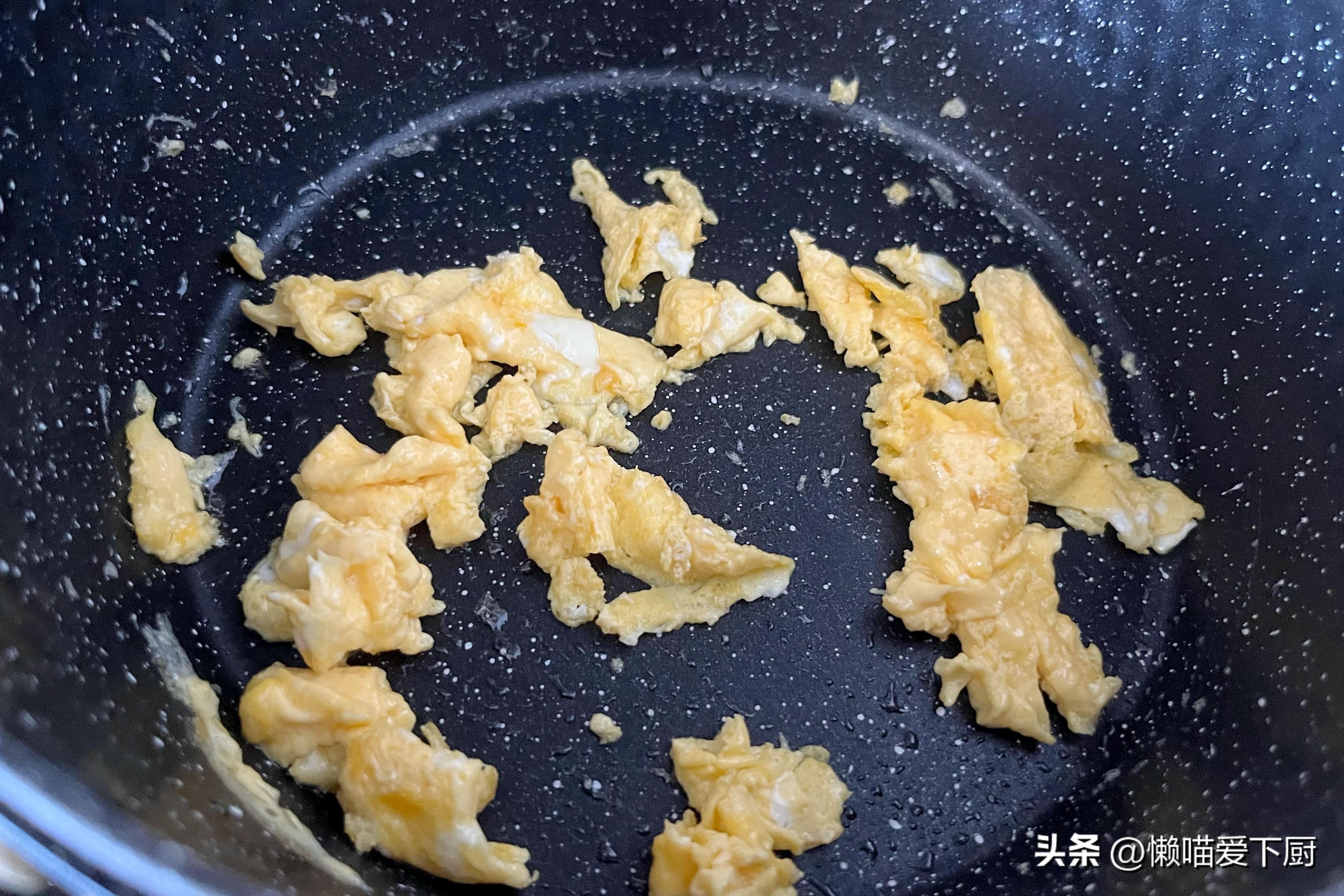 3、鍋中加油,先倒入蛋液,小火煎至凝固,然後鏟碎盛出來備用;