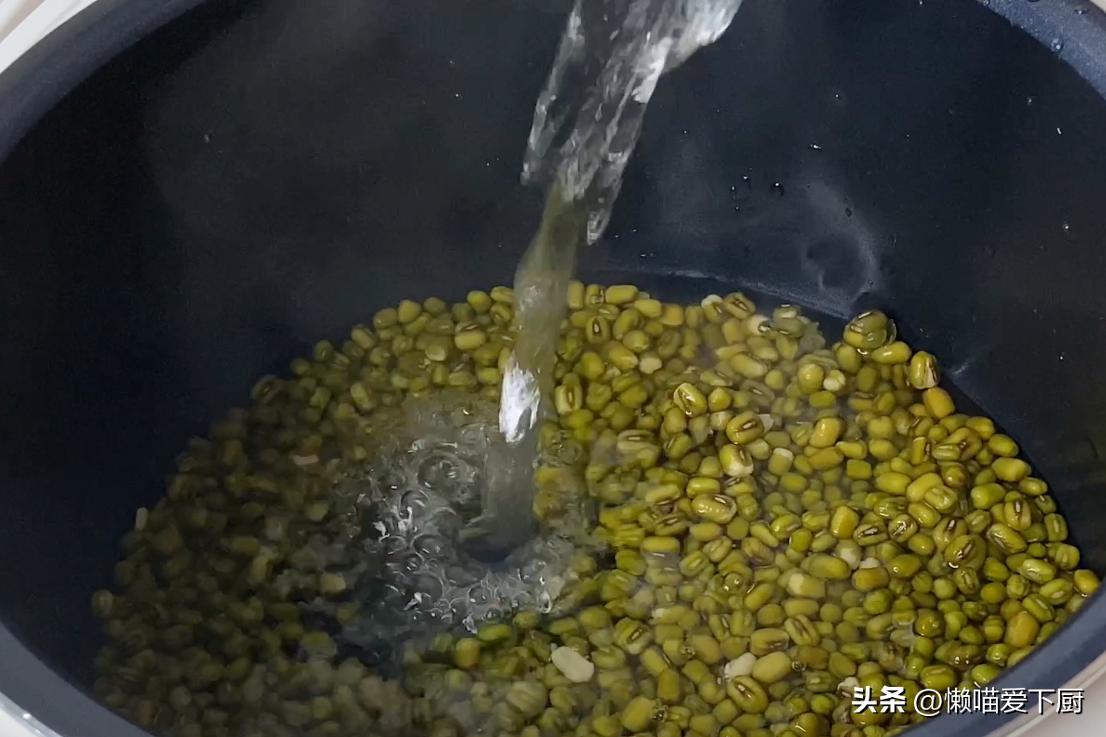 2、將浸泡好的綠豆倒入鍋中,加適量熱水;