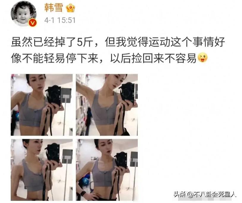 另一位女星韓雪,她身材高挑、四肢纖瘦,本身就不屬於豐腴美人,可最近她曬出一組運動照片,表示自己又瘦了5斤。