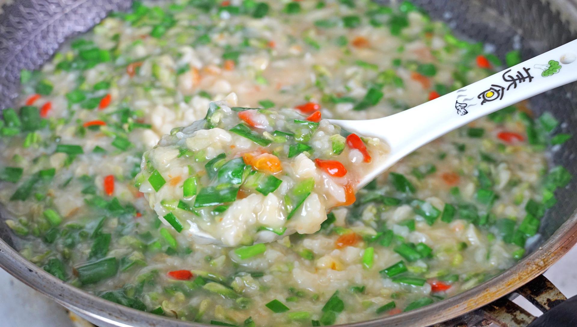 6、然後繼續煮 5 分鐘,麪疙瘩煮熟後加一勺鹽、一勺雞精、一勺生抽。最後倒入槐花和韭菜,再來一勺香油,一把枸杞拌勻後就可以出鍋了。