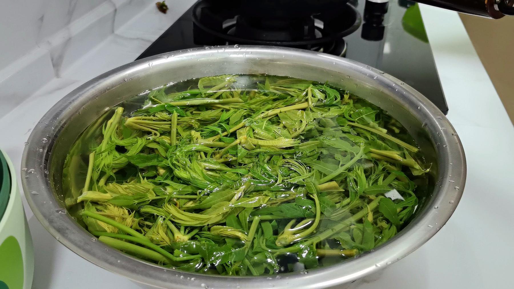 1、香椿清洗乾淨,然後焯水。水燒開之後滴幾滴食用油,倒入香椿,來回翻動焯燙1分鐘左右;