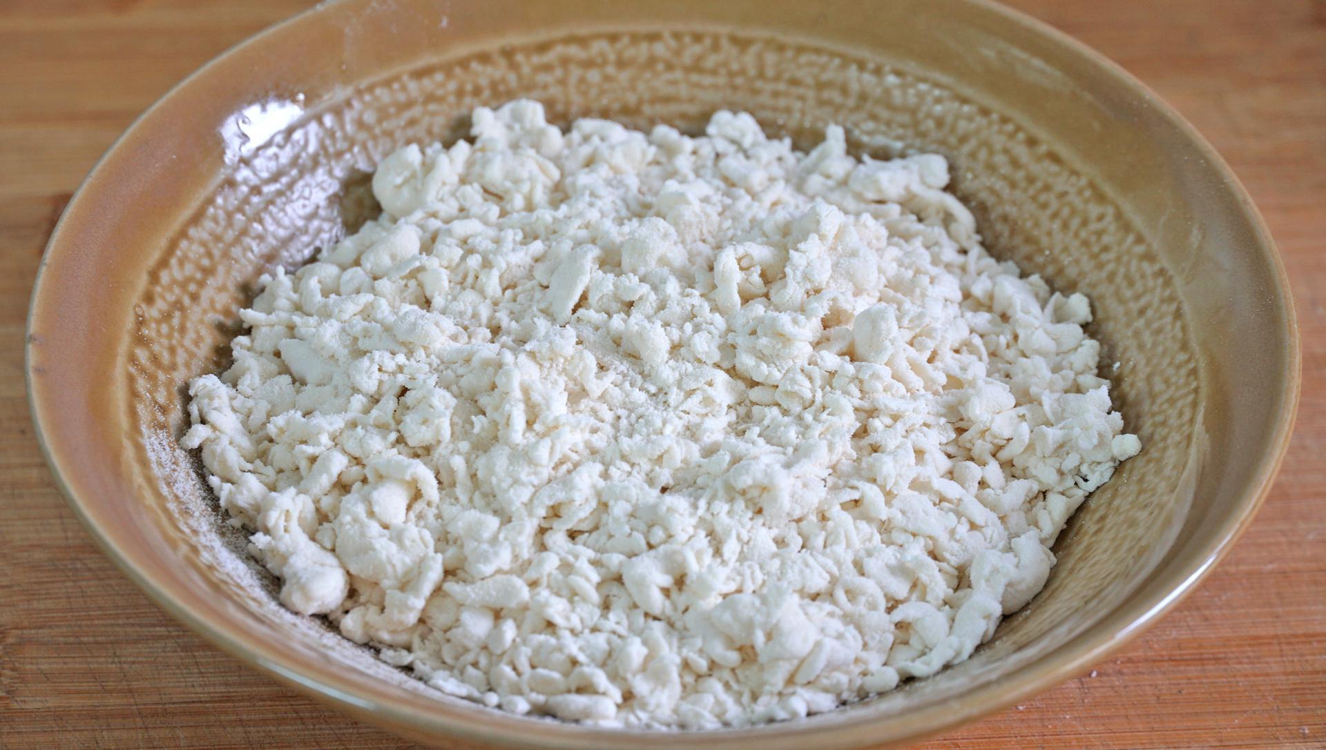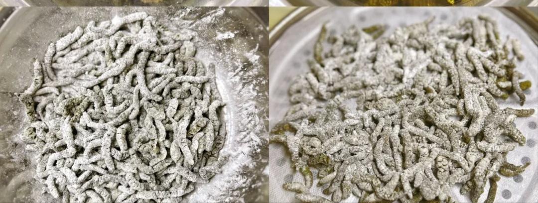 2、攥幹水分,加油鎖住水分,少量多次加麪粉,用筷子從底部往上抄拌,水開上汽蒸1分鐘;