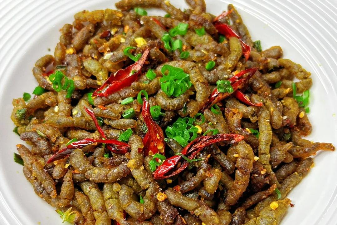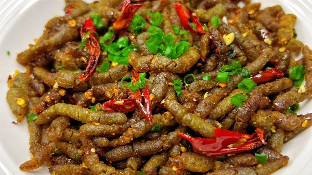 5、楮不揪翻炒、生抽耗油、一勺辣椒油、適量鹽,白糖,雞精粉翻炒均勻出鍋,加點蔥花就可以出鍋了。