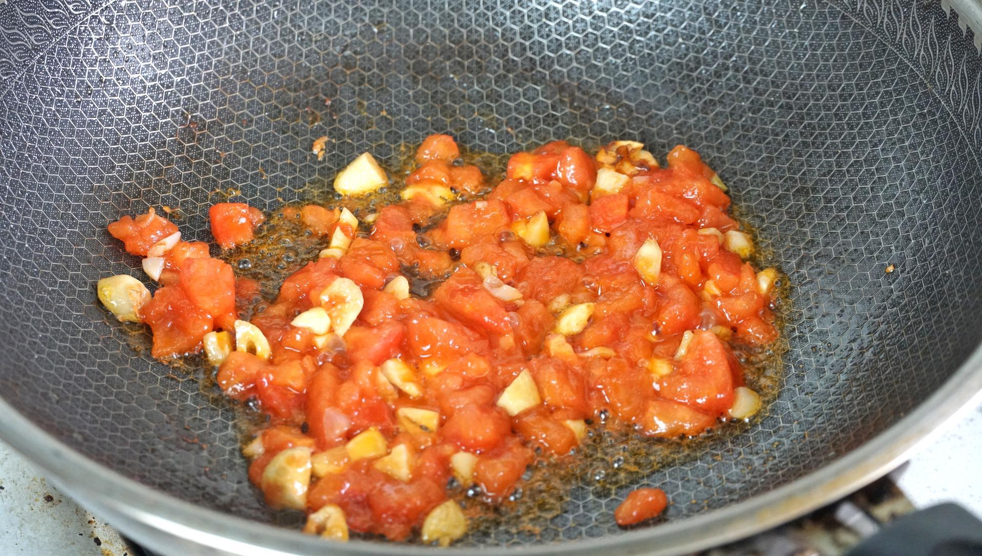 5、起鍋熱油,倒入蒜末爆香,接着把西紅柿倒進來炒一炒,加一勺鹽會更容易出汁兒。西紅柿炒好後倒入一碗清水,大火煮開,然後倒入我們麪疙瘩,煮的時候輕輕的用鍋鏟推動一下。