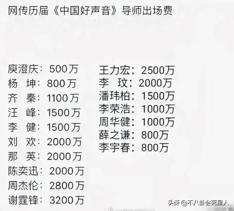 光是之前網曝《好聲音》的導師演出費中,那英的演出費就高達2千萬,而那英一共參加了8季,光是這個綜藝節目就爲她賺到了上億元。