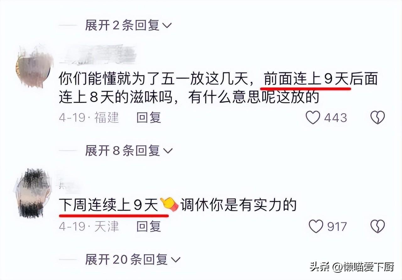 雖說名義上是有小長假,但在實際落實的過程中,因爲單休制、值班制等單位安排,導致放假期間,還要上比平時更長時間的班,加劇了人們的疲憊感。比如就有網友表示,自己要連上9天班。