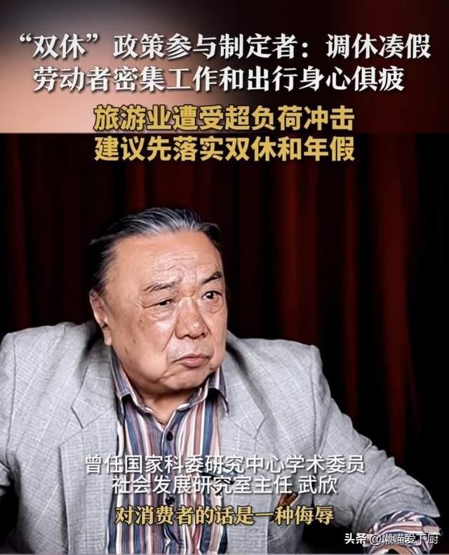 曾參與“雙休”政策制定的武欣主任,在接受媒體訪問時說出了自己的看法。武主任認爲,“調休之後,讓人們密集的工作,瘋狂的去旅行,把長假變成了消費日,對旅遊經濟是殘酷的摧殘,對消費者是一種侮辱”,讓人身心俱疲。